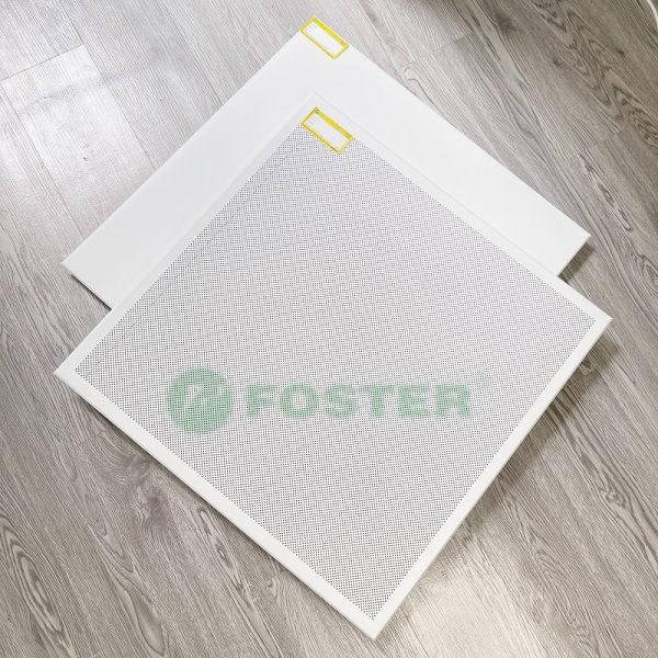 Trần nhôm Clip-in 600×600 bề mặt được đục lỗ và được trang bị một lớp vải không dệt để kiểm soát âm thanh và giảm tiếng ồn.