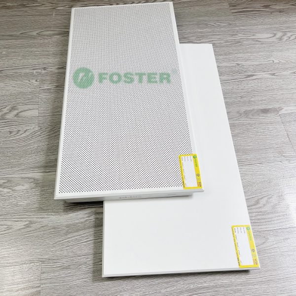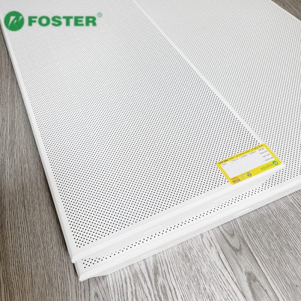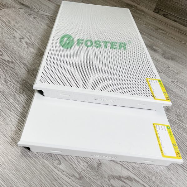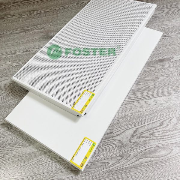 Trần nhôm Foster Clip-in 300×600 bề mặt được đục lỗ và được trang bị một lớp vải không dệt để kiểm soát âm thanh và giảm tiếng ồn.